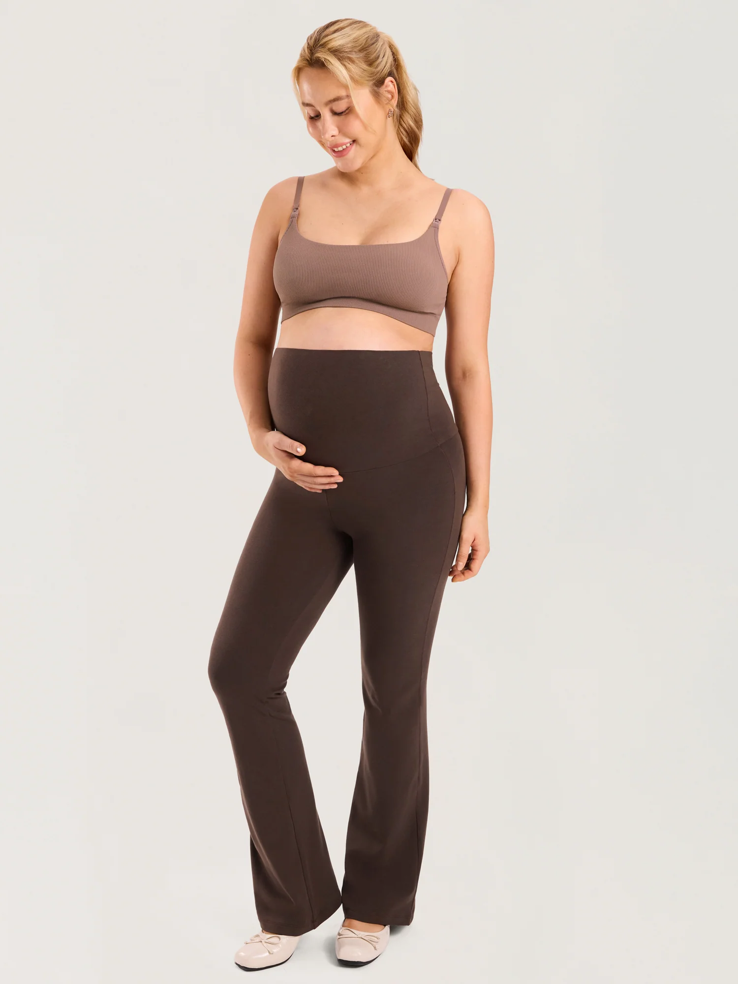Discover featherlight comfort in our signature cotton maternity pants. The innovative foldover waistband adapts seamlessly to your changing shape, while the elegant flare cut creates a sophisticated silhouette that adds a polished twist to your casual looks. Perfect for pregnancy wear and beyond.