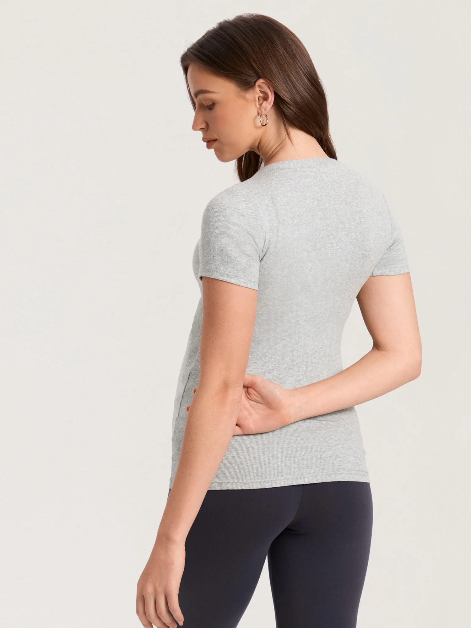 This soft cotton rib maternity tee features a stylish Henley neckline with practical front buttons for easy nursing access. Perfect for everyday comfort with a flattering silhouette.